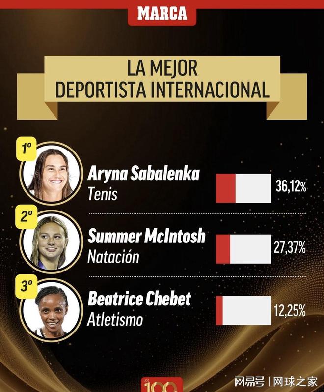 在国际女子运动员类别中,现世界排名第一的萨巴伦卡凭借2025赛季的稳定发挥和多项重要赛事冠军,成功当选年度最佳女子运动员。她的得票率领先于加拿大游泳天才夏季·麦金托什和肯尼亚长跑名将比阿特丽斯·切贝特。