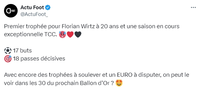 勒沃库森提前5轮锁定冠军,20岁的维尔茨再次成为热门话题。关于维尔茨距离金球奖有多远?来看看媒体和网友是怎么说的: