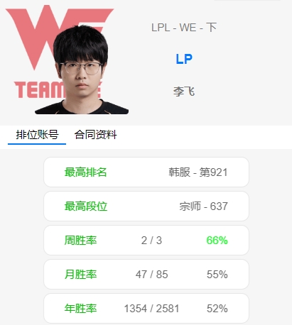 4月16日讯 LP或加入WE,韩服统计小程序OBGG,将LP选手加入到了WE的队伍列表中。