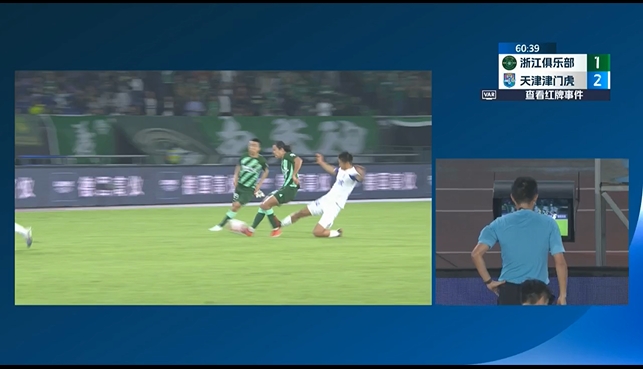 04月19日讯 中超第7轮,浙江vs天津津门虎。比赛第62分钟,黄嘉辉身后飞铲李提香,裁判首先判罚黄牌,随后主裁判亲自观看视频回放,在经过VAR视频确认后改判红牌。津门虎10人应战。