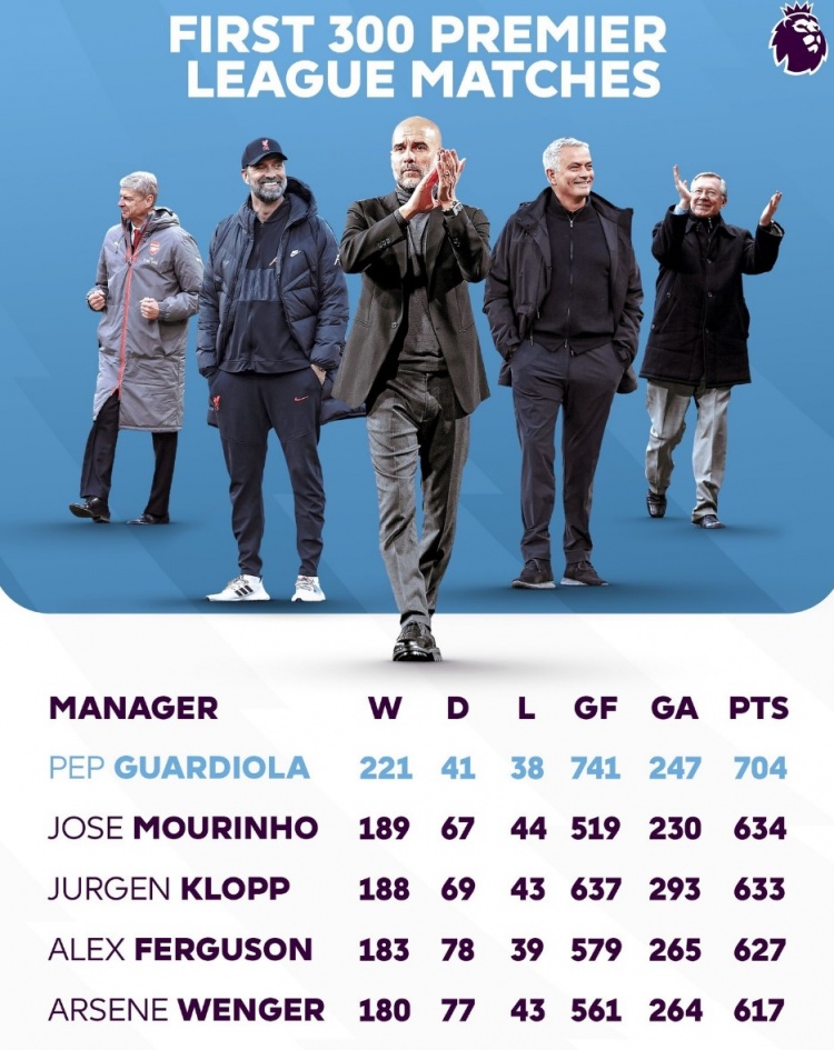 英超官方统计了主帅带队前300场的数据,其中,瓜帅收获了惊人的221场胜利,共积704分断层领先,穆帅、克洛普分列二三。