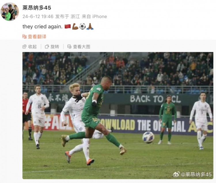 莱昂纳多在社媒晒出了亚冠赛场上浙江队主场3-2击败武里南联的照片,结合这次泰国队因为胜负关系的劣势,只能目送国足晋级18强赛,因此莱昂纳多配文写道:“他们又哭了。