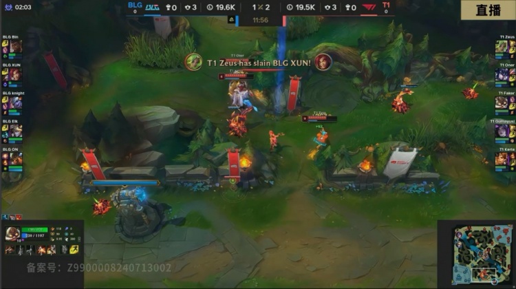 【8:14】婕拉收掉BLG第一题奥小龙,猪妹河道甩狙被婕拉闪现躲开,但还是难逃一死,婕拉死前扔出大招但毫无作用,Faker飞机拿到人头。