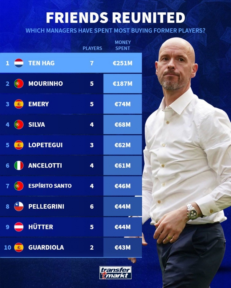 7月10日宣 德国转会市场统计了主教练引进旧将花费的费用,其中,滕哈赫在执教生涯中累积签下了7名旧将,花费2.51亿欧排名榜首,穆帅花费1.87亿欧排在第二,安帅第6、瓜帅第10。