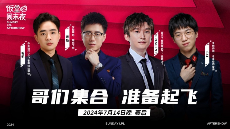 7月13日宣 英雄联盟赛事官方发布7月14日《饭堂周末夜》节目预告,本期嘉宾为毛毛、米勒、白色月牙、Cat。