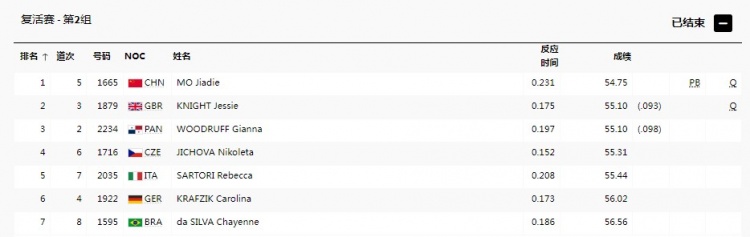 中国选手莫家蝶被分在第2组出战,最终莫家蝶发挥出色,跑出54秒75的个人最好成绩,位列小组第一,强势晋级半决赛!