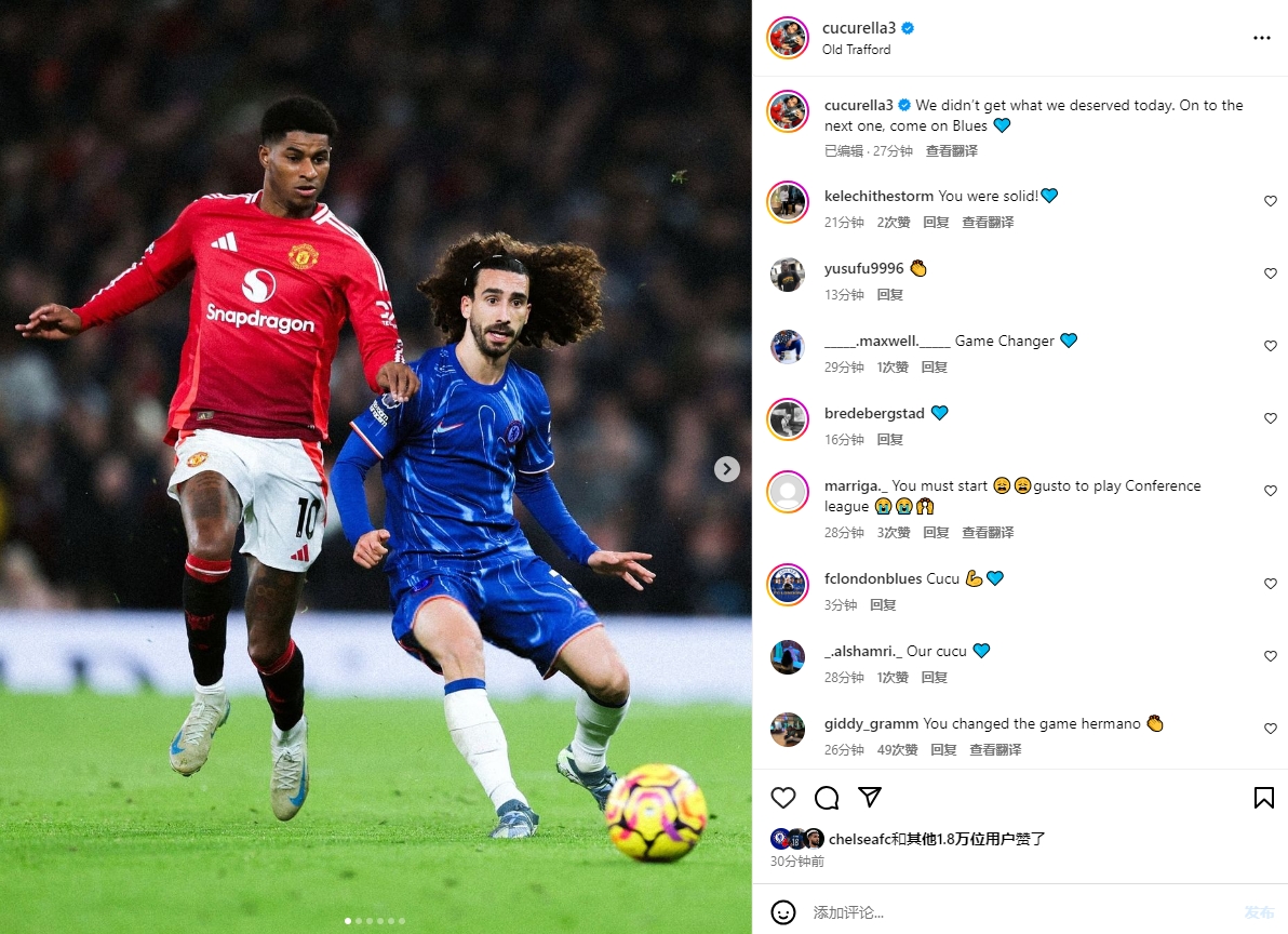 11月4日宣 英超第10轮,曼联主场1-1切尔西。赛后,库库雷利亚更新了社媒。
