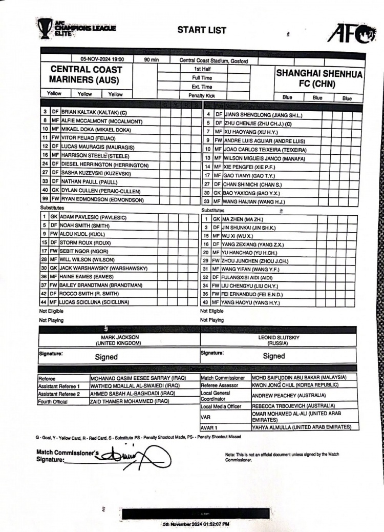 202425亚冠精英联赛第4轮中央海岸水手vs上海申花首发名单