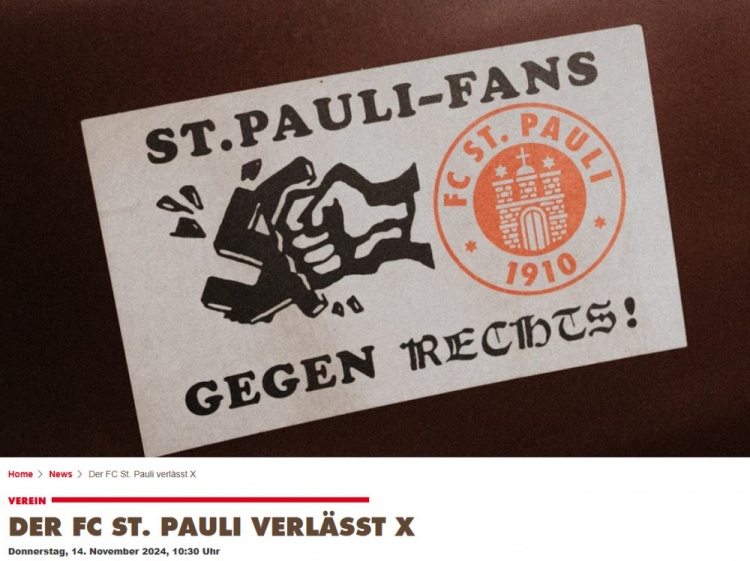 “圣保利俱乐部已经限制了X的使用,并主要发布支持多样性和包容性的政治声明,以表明反对仇恨的立场。现在俱乐部将停止在X上的活动,该账户将不再使用,但过去十一年的内容仍将保留在网上,因为这些内容具有历史价值。”