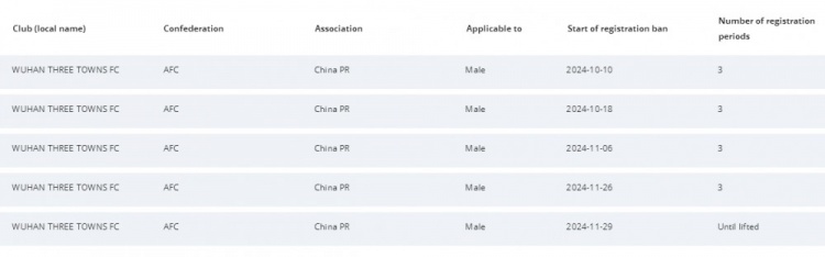 在11月29日更新的国际足联注册禁令披露系统中,武汉三镇再次更新禁令,和以往10次显示的禁止注册期限3期不同,此次禁止注册期限变更为“直至解除”。