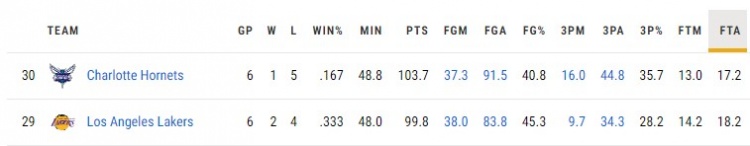 湖人近6战仅2胜场均得分&三分命中率联盟倒1篮板&罚球数倒2