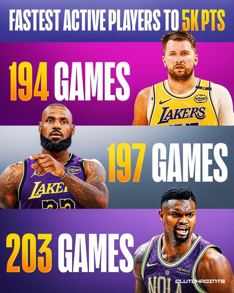 现役生涯得到5000分最快球员:东契奇(194场)、詹姆斯(197场)、锡安(203场)