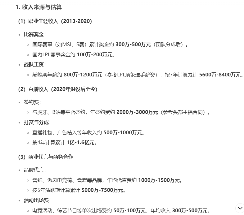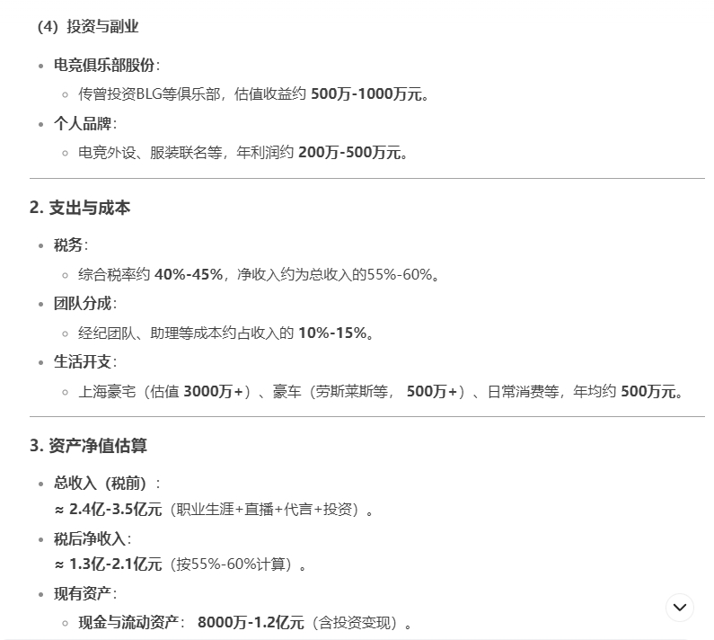 根据Deepseek深度思考,AI测算数据显示Uzi目前的总资产或达1.5亿~2.5亿,若商务合作稳定或将接近3亿元!