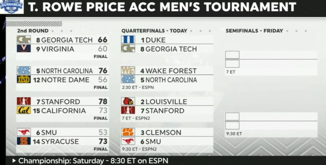 杜克大学将在半决赛中面对维克森林大学和北卡大学的胜者。