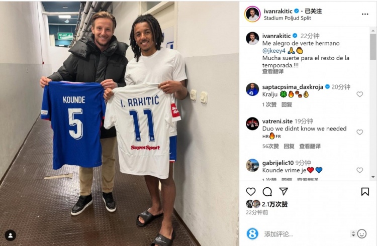 目前效力于哈伊杜克的拉基蒂奇社媒晒出与孔德互换球衣的照片,配文:“很高兴见到你,我的兄弟孔德,祝你在本赛季余下的比赛中好运!”