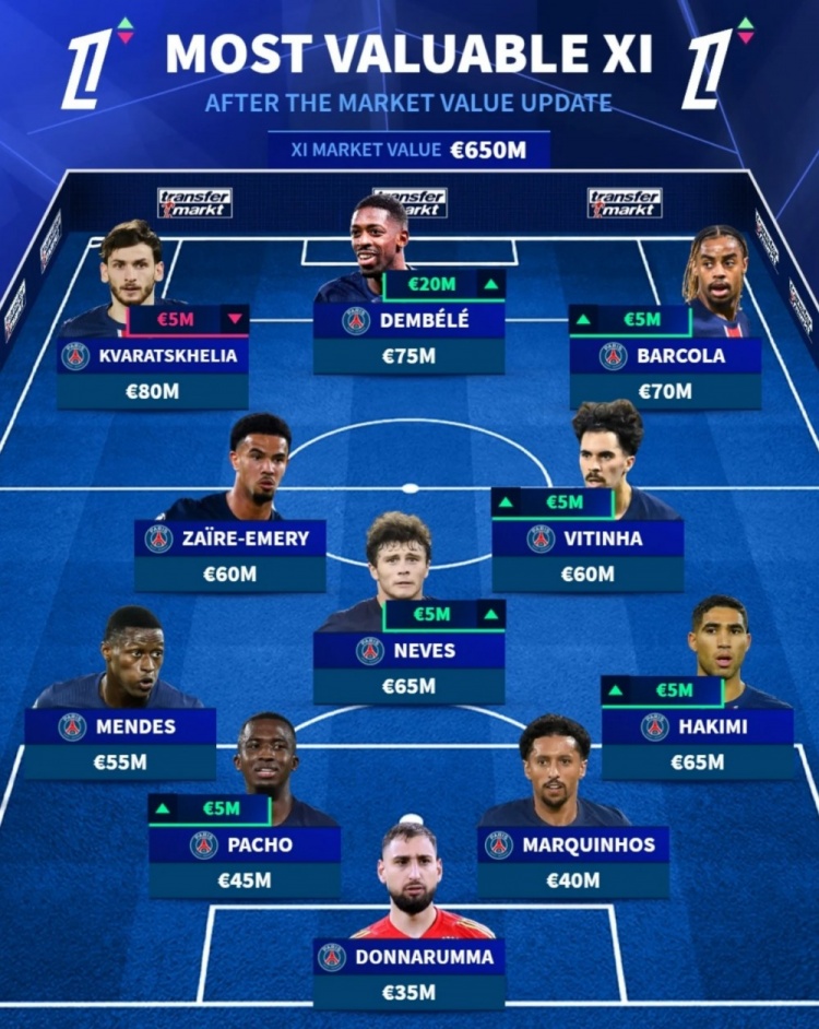 前锋:克瓦拉茨赫利亚(8000万欧,下降500万欧)、登贝莱(7500万欧,上涨2000万欧)、巴尔科拉(7000万欧,上涨500万欧)