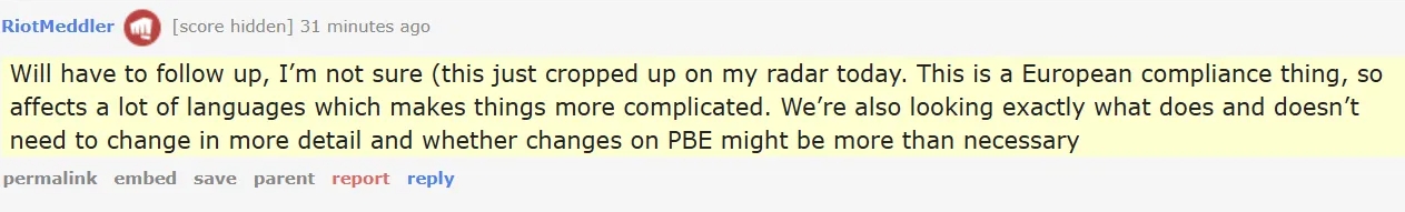 4月18日宣 在今晨的美测服改动中,酒桶的W技能【醉酒狂暴】更名为【喧闹狂暴】,此外酒桶技能中关于“醉酒”的描述也全部被删除。随后LOL官方表示这一改动是为了符合不同地区的年龄分级要求。而随后LOL官方在论坛回复玩家时对这种情况做出了进一步解释,大意如下:我们还需要进一步确认,目前还没确定(这个问题是今天才开始进入我们视线的)。由于欧洲地区的合规要求,并且它还会影响到不同版本的语言文本,我们正在详细评估哪些内容必须修改,哪些可以保留。同时也在审视目前美测服的改动是否过度。