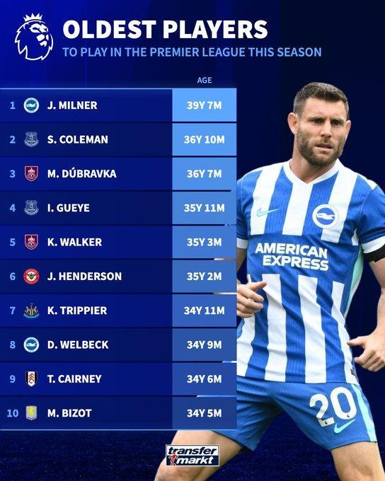1、米尔纳(布莱顿):39岁7个月