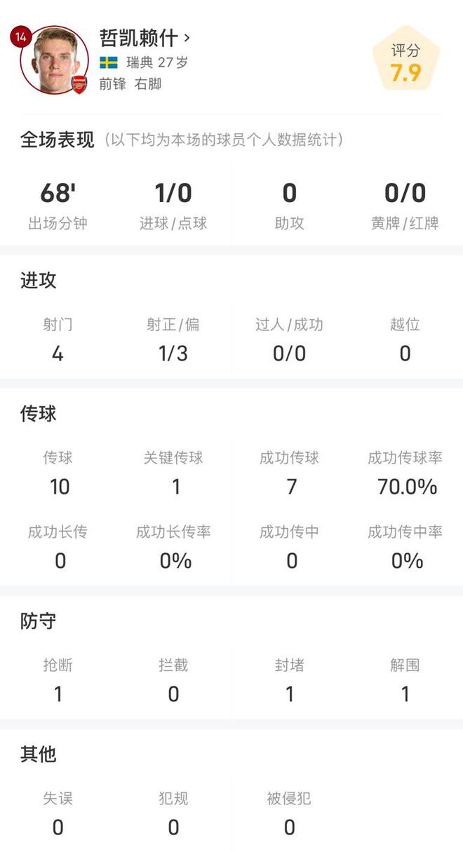 哲凯赖什本场出战68分钟,4次射门1次射正,进1球,10次传球7次成功,传球成功率70%。此外,他还贡献1次抢断、1次封堵和1次解围,本场评分7.9分。