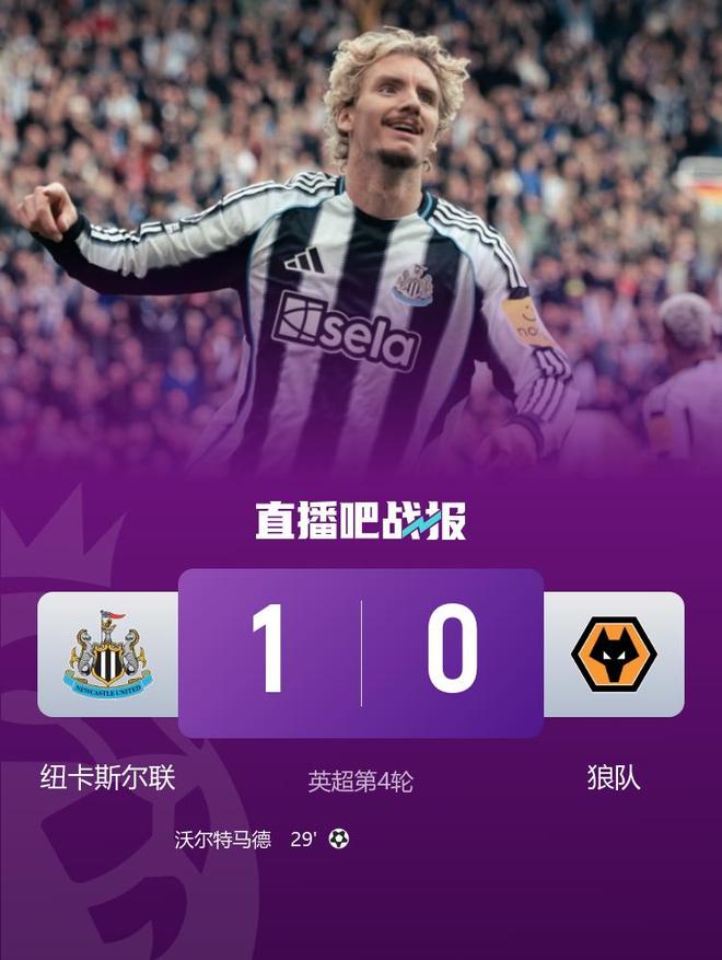 第29分钟,纽卡右路送出传中,沃尔特马德头球抢点破门,纽卡斯尔联1-0狼队。↓