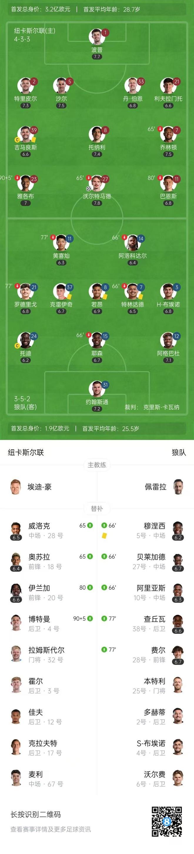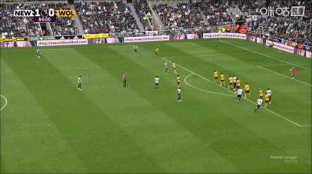 全场比赛结束,纽卡斯尔联1-0狼队。
