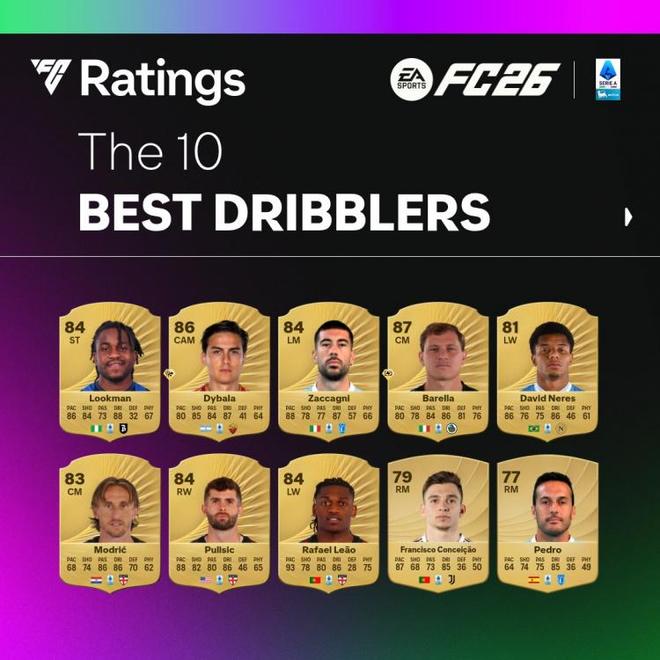 意甲FC26盘带前10球员:卢克曼88居首,迪巴拉第二,米兰3人在列