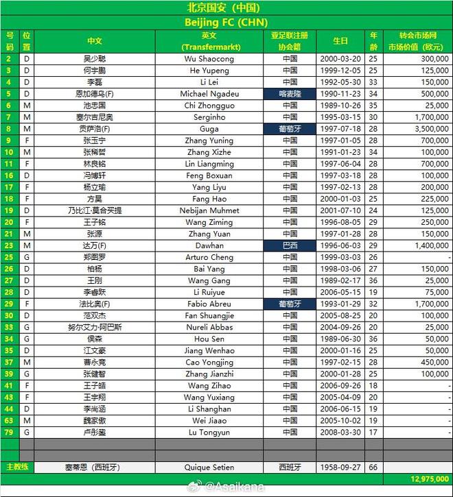 北京时间9月13日,德国转会市场亚洲区管理员朱艺 公布了北京国安参加亚冠二级联赛(小组赛阶段)的大名单。