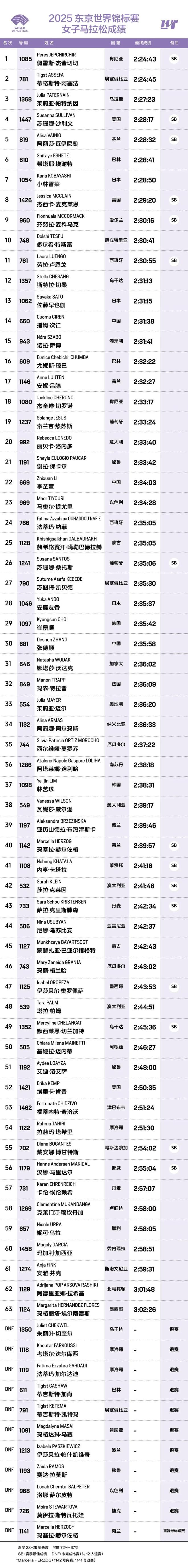阿塞法以两秒之差屈居亚军,继去年巴黎奥运会摘银后再度收获一枚银牌。“我不愿视之为错失金牌,更愿积极看成我夺得了一枚银牌。每块奖牌无论来自奥运会或世锦赛,对我都意义非凡。”她坦言,“东京备赛期间遭遇诸多困难。今年伦敦破世界纪录后经历了漫长休整却未能完全恢复。说实话,破纪录之战比本次轻松得多——当时有配速员、针对性训练和理想条件。今日情况不同,但我认为自己成功应对了所有挑战。”