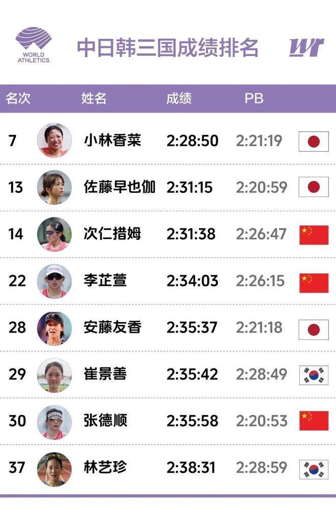 首次代表日本出战世锦赛的小林香菜前面5公里一度领跑,直到20公里处还位列第四,最终以第七名完赛,成绩2:28:49,刷新了自己赛季最好成绩。