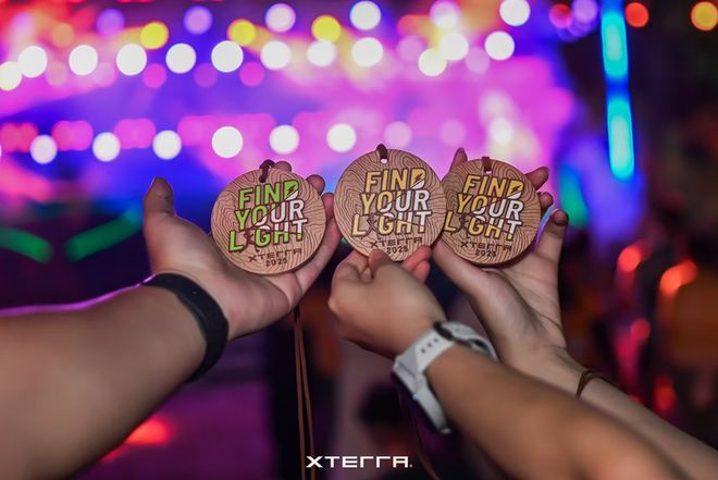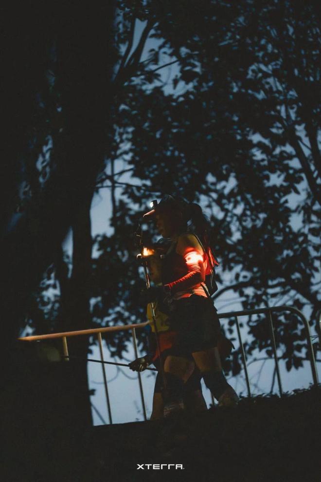 “喜欢晚上跑是因为更有那种探索的感觉,跟白天不一样的地方是,晚上你只能看到你的头灯照亮的地方。”李沁钊分享道,“夜赛,我只参加过XTERRA的,氛围很好。跑之前跟大家一起热身喊口号,然后从傍晚跑到太阳落山再到晚上,头灯一开,挺浪漫。而且XTERRA的这个比赛啊,我觉得路段挺丰富,12K组别300多的爬升难度也不大,哪怕是晚上,对于入门选手也非常友好安全。正常情况,我们晚上是不会去跑比赛的,但正是有了XTERRA这样的夜赛,才让我们有了机会去解锁晚上越野的体验。”