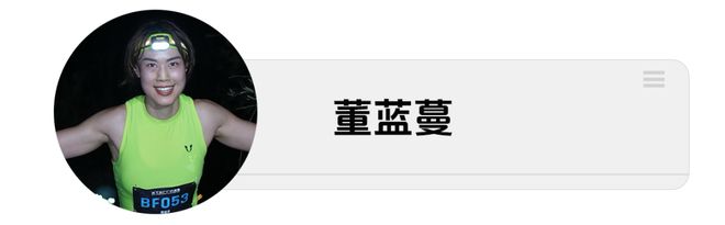 对于为什么会选择夜赛,她的理由很简单——“越野赛当中,尤其是长距离的比赛,在夜晚中奔跑是一个不可避免的情况。因为后续我还想要往更长距离的越野比赛方向去探索和发展(已经报了莫干山35公里和大蜀道50公里比赛),所以夜赛是必须的经历。我也想看看自身是否适应晚上跑。”董蓝蔓分析道。此外,享受夜赛的不确定性也是一个重要理由——在山里,尤其晚上会有更多不可控的因素。“我自己本身的性格不太喜欢一成不变的,所以当我面对这种不确定性和可能比预期更具备挑战力的时候,我会觉得是一件很有意思的事情。我挺喜欢这种不确定性,在黑暗的环境里,可以让人更加的专注。”