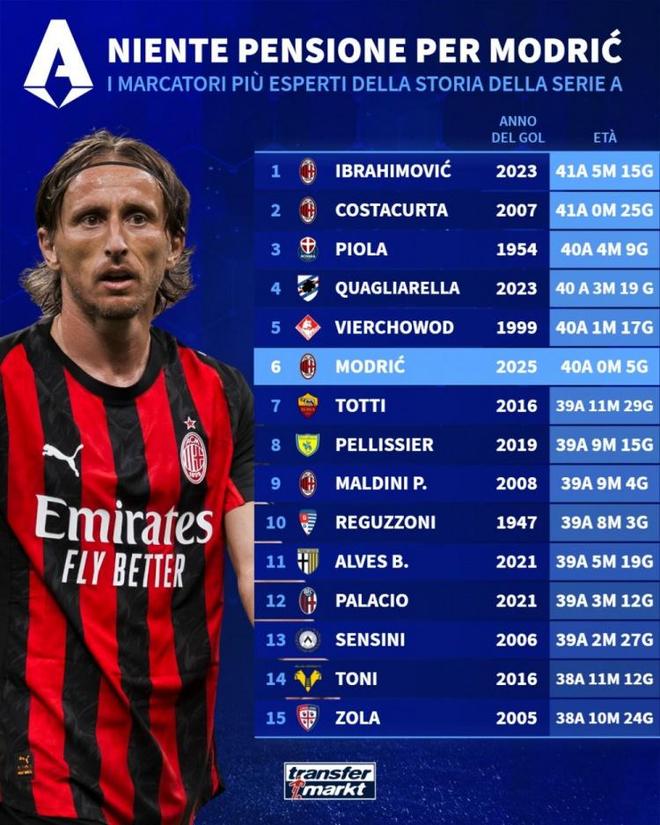 直播吧9月15日宣 意甲第3轮比赛,莫德里奇破门,帮助米兰主场1-0击败博洛尼亚。德国转会市场列出了意甲年龄最大进球者排名,伊布居首,莫德里奇排名第6位。