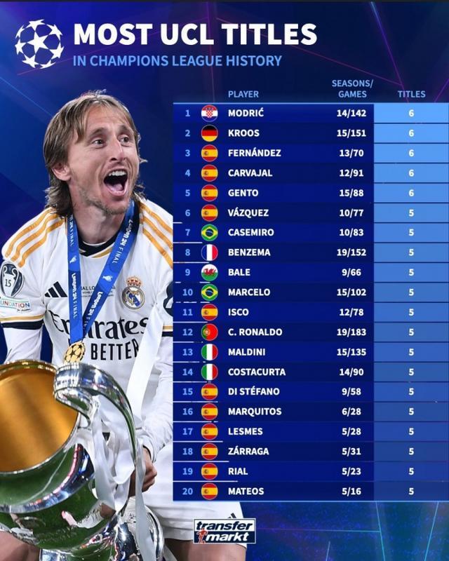 直播吧9月16日宣 德国转会市场统计了教练、球员夺得欧冠的次数,并分别列出榜单,教练之中安切洛蒂5冠居首,球员之中莫德里奇、克罗斯、纳乔、卡瓦哈尔、亨托6冠最多。