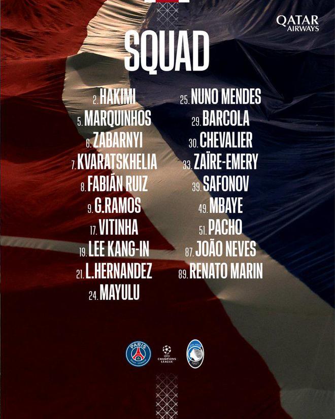 大巴黎欧冠对阵亚特兰大大名单:登贝莱和杜埃继续缺席