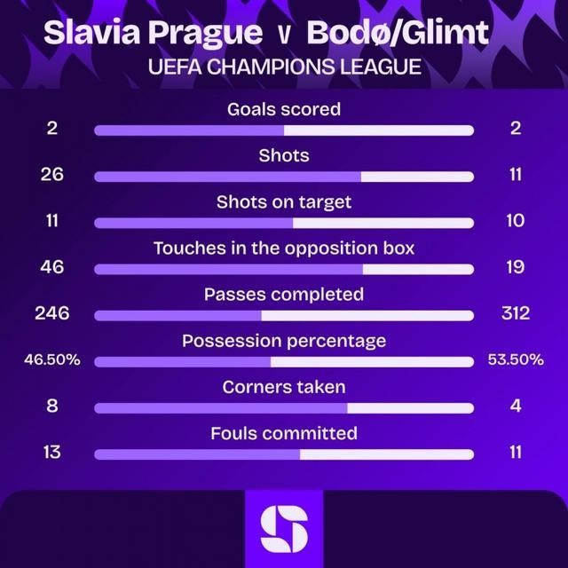 此役布拉格斯拉维亚射正11次,博德闪耀射正10次。据Squawka统计,这是近10个赛季第3场双方都射正10+的欧冠比赛,前2场为2017年莱比锡vs贝西克塔斯、2020年萨尔茨堡vs拜仁。