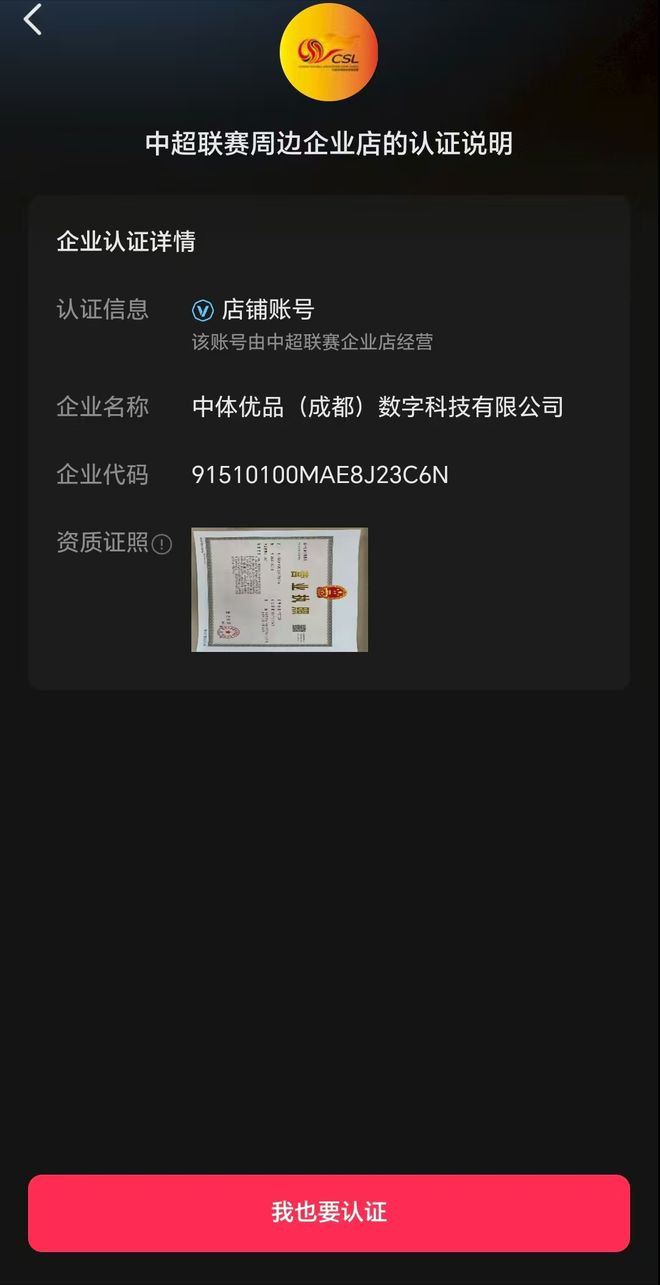 根据平台官方的信息,这家中超官方周边店铺认证的企业信息是“中体优品(成都)数字科技有限公司”!