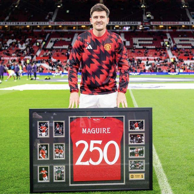 对阵切尔西赛前,马奎尔领取曼联生涯250场里程碑纪念球衣