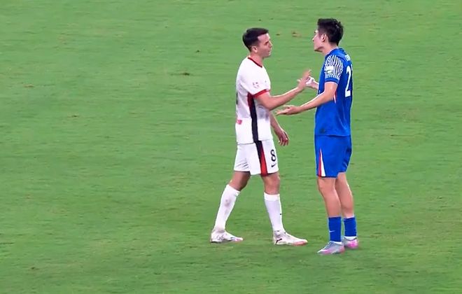 第41分钟,徐皓阳禁区内挑球转身,皮球疑似打在李扬的上臂,申花球员投诉手球,VAR介入,比赛继续进行。