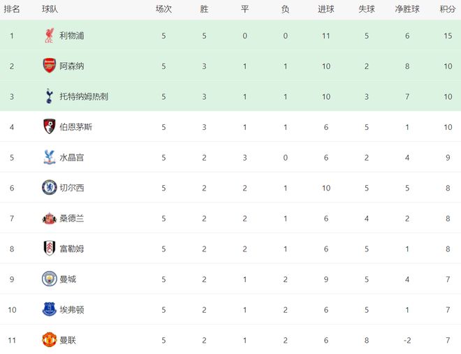 这一轮众多强队纷纷丢分,只有利物浦最稳。在积分榜上,5战全胜的利物浦以15分排名榜首。竞争对手都丢分,利物浦扩大了领先优势。排名第2的是阿森纳,拿到10分。热刺和伯恩茅斯也都是10个积分。水晶宫9分排名第5。第6的是切尔西,只拿到8分。曼城2胜1平1负,只拿到7分,排名第9。曼联也是7分,排名第11。