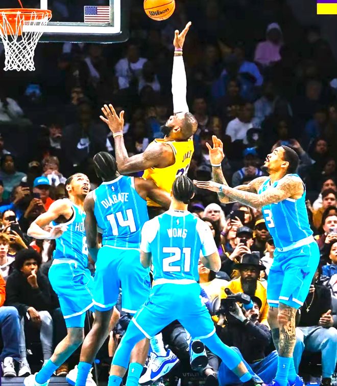 确实,詹姆斯从不怕包夹,甚至“享受包夹”—— 他能在被两人围堵时,用眼角余光锁定队友位置,用不看人传球送到空位;他能在突破吸引三人防守时,突然分球给外线射手,制造三分机会。对詹姆斯的包夹,更像是一种 “无奈选择”:不包夹,他能单砍 30+;包夹,他能送10+助攻。这种 “要么让他得分,要么让他队友得分” 的困境,正是詹姆斯 “全能统治力” 的最佳证明。