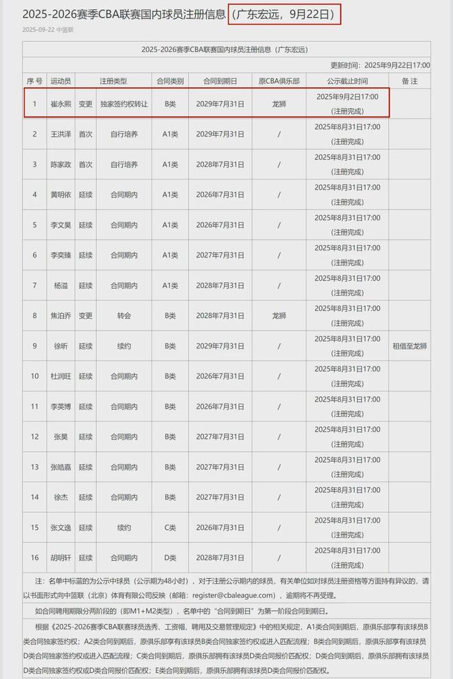 CBA官网更新国内球员名单:广东宏远已经为崔永熙正式注册,双方签下4年B类合同,2029年夏天合同到期,届时广东男篮享有崔永熙D类(顶薪)合同独家签约权。崔永熙在广东宏远将身披24号球衣!
