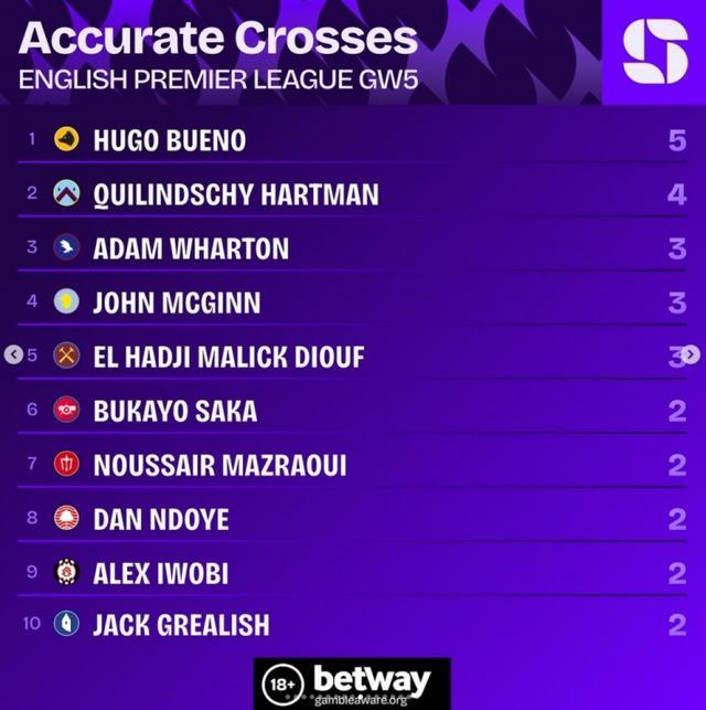 直播吧9月24日宣 英超第5轮战罢,squawkafootball列各项数据排行,狼队后卫乌戈-布埃诺是精准传中次数最多的球员,共5次。
