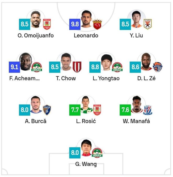 与刘洋同时入选第25轮最佳阵容的还有:长春亚泰的前锋奥莫伊胡安弗、后卫罗西奇,上海海港前锋莱昂纳多,河南队的前锋阿奇姆彭、中场卢永涛、门将王国明,成都蓉城中场周丁洋,青岛海牛前锋兰克尔·泽,云南玉昆后卫布尔克,以及上海申花后卫马纳法。