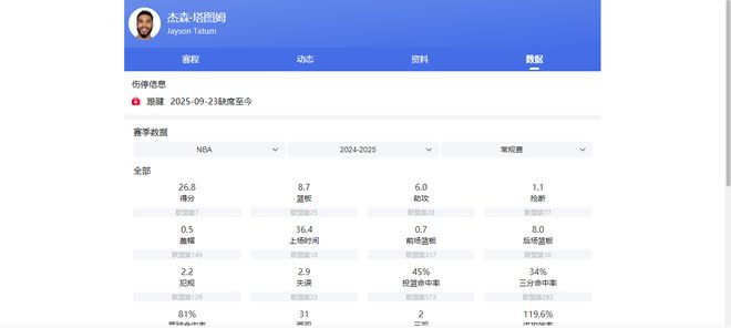 NBA24-25赛季常规赛,塔图姆场均可为球队贡献26.8分8.7篮板6助攻。