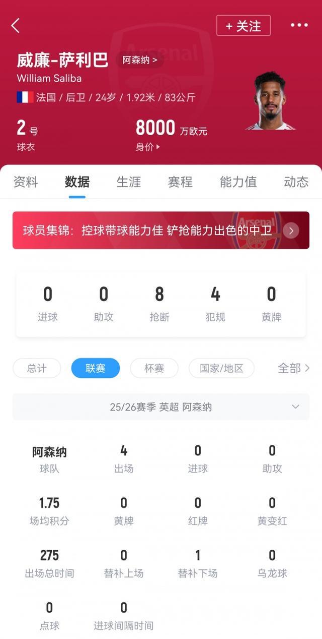 萨利巴现年24岁,法国中卫,阿森纳在2019年花费3000万欧元将其从圣埃蒂安签下。目前萨利巴总计代表枪手出战139次,贡献7球3助,随队收获两个社区盾冠军。目前球员德转身价为8000万欧元。
