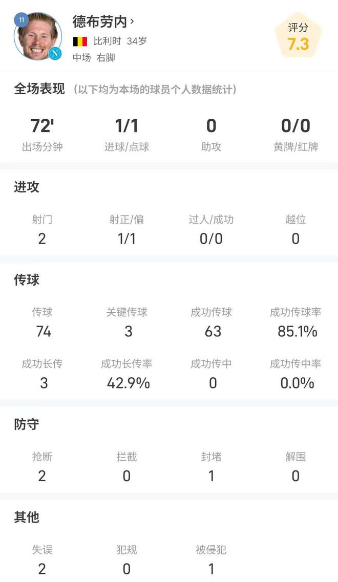 德布劳内全场数据:2射1正点射破门,送出3次关键传球