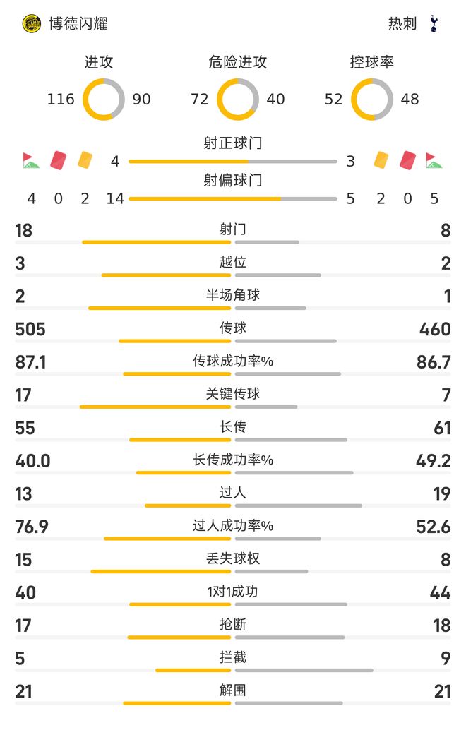 控球率方面,双方呈现势均力敌之势,博德闪耀控球率52%,热刺控球率48%。进攻次数上,博德闪耀116次,热刺90次。危险进攻次数方面,博德闪耀72次,热刺40次。