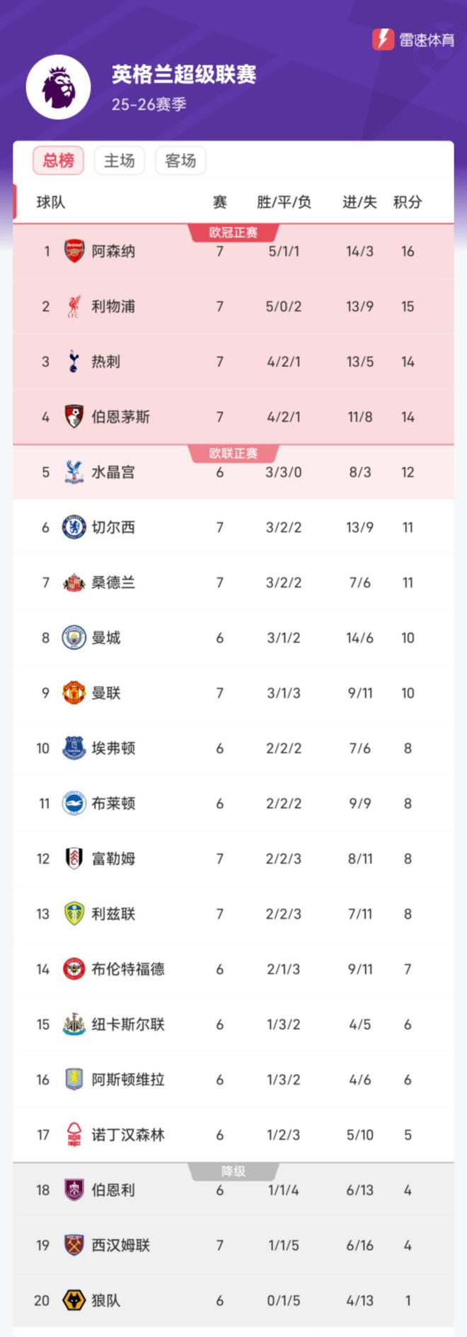 雷速体育10月5日宣 随着英超今日比赛的结束,英超的榜首也发生了更迭。利物浦遭遇连败后跌落第二,而阿森纳反超登上了头把交椅。