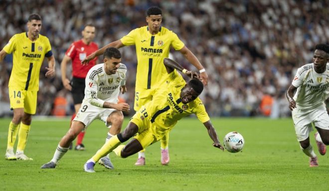 皇马上轮客场惨败不敌马竞,全胜被终止,榜首也被巴萨抢走。今天回到主场对阵第3的比利亚雷亚尔,皇马是铆足了劲压着黄潜猛攻,毕竟要是再输球,排名还要继续下跌。开场后皇马完全压制黄潜,只不过他们迟迟未能把握机会,第6分钟,姆巴佩禁区左侧前沿巧妙直塞,居莱尔禁区内接球转身扫射打偏了。第19分钟,姆巴佩强行突入禁区左侧倒地大力卧射,门将特纳斯奋力将球扑住。2分钟后,姆巴佩又突入禁区左侧,这次他倒三角回传做球,马斯坦托诺点球点处获得绝佳机会,然而他左脚大力推射打了飞机。场面被动的比利亚雷亚尔上半时尾声阶段倒是差点率先进球,他们后场反击,科梅萨尼亚中场策应精妙直塞,奥卢瓦塞伊高速插上拿球突入禁区获得半单刀良机,只不过他推射被门将库尔图瓦神勇扑出。