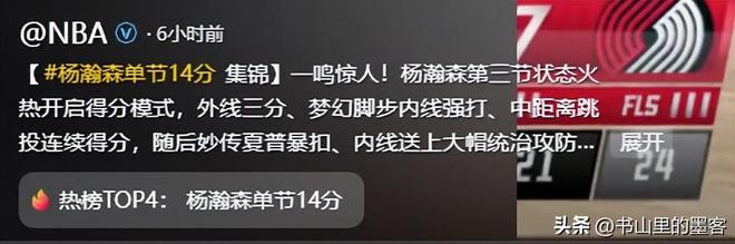 开拓者的第二场季前赛中,杨瀚森出战仅17分钟单人狂砍14分,4篮板1助攻3封盖。